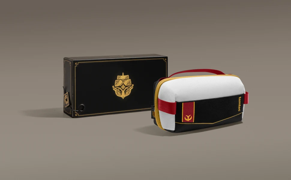 Tomtoc Monster Hunter Rise - A05 Royal Order Accessory Bag thiết kế dựa trên trang phục của các hiệp sĩ Vương quốc trong trò chơi Monster Hunter Rise: Sunbreak, dòng sản phẩm Royal Order kết hợp màu đen, vàng và đỏ, tượng trưng cho lòng tự hào và vinh quang của họ.